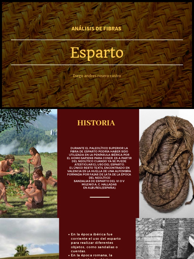 No existen datos que demuestren que el esparto haya sido utilizado durante el paleoltico 4 habiendo hiptesis que durante el paleoltico superior la fibra de esparto podra haber sido utilizada en la pennsula ibrica por el homo sapiens para coser. Esparto es el nombre con el que se conoce en Espaa a unas fibras obtenidas de diversas plantas silvestres del grupo de las gramneas as como a las plantas mismas. La pleita manufactura espaola a base de esparto tejido.